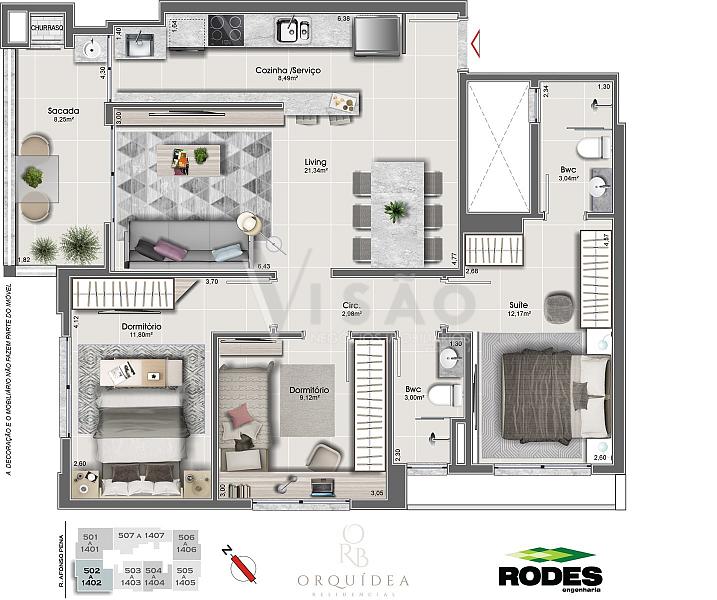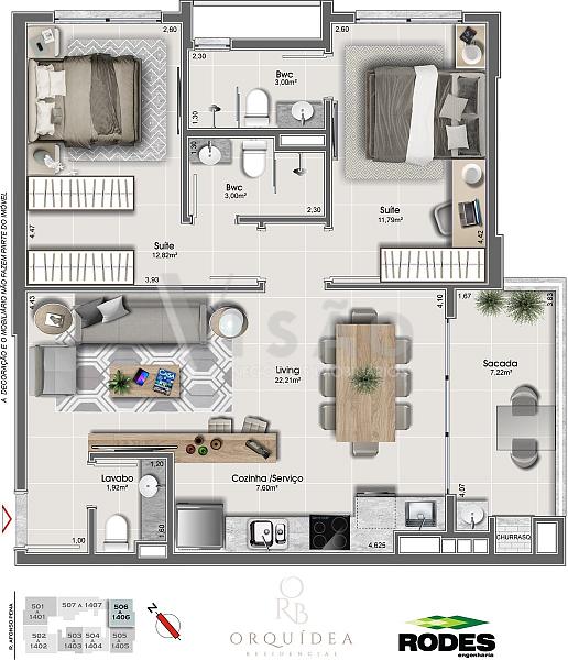• 1502 e 1512 – 2 Suítes, 108,89m², sendo 25,73m² de Terraço.