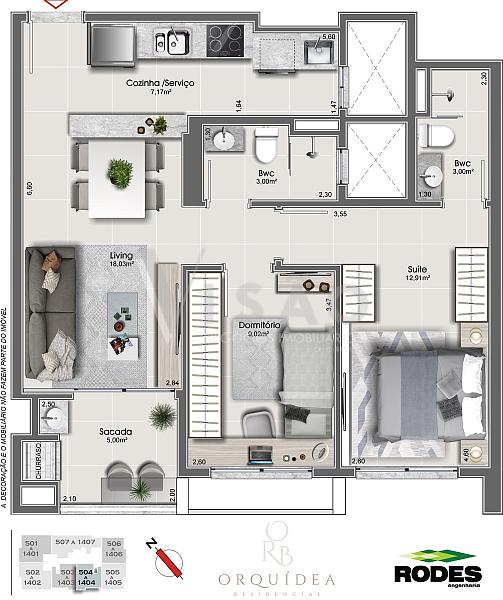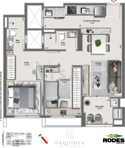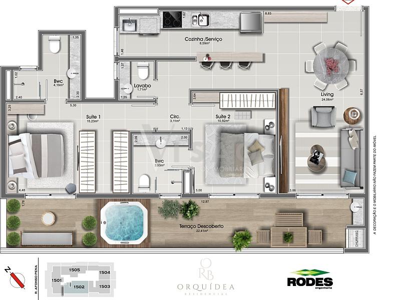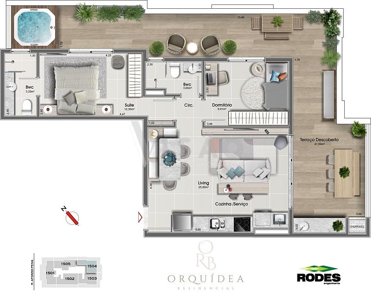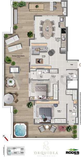 • 1503 e 1513 – 2 Suítes, 125,84m², sendo 50,62m² de Terraço.