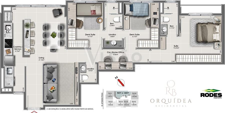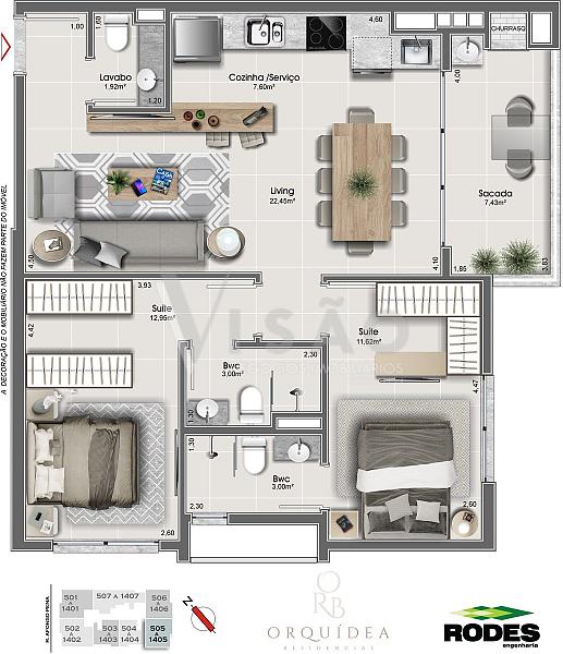 • 1505 e 1515 – 2 Dormitórios, 1 Suíte, 99,11m², sendo 28,78m² de Terraço.