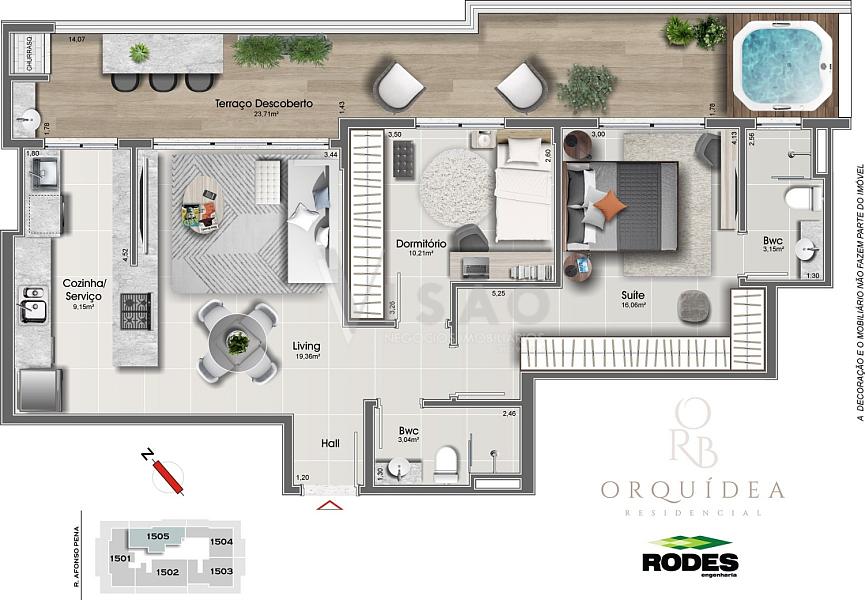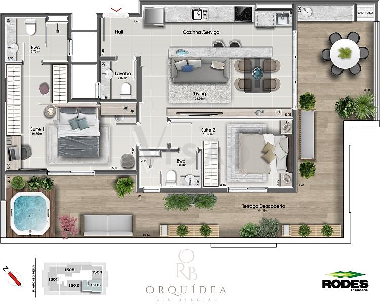 • 1504 e 1514 – 2 Dormitórios, 1 Suíte, 110,26m², sendo 48,11m² de Terraço.
