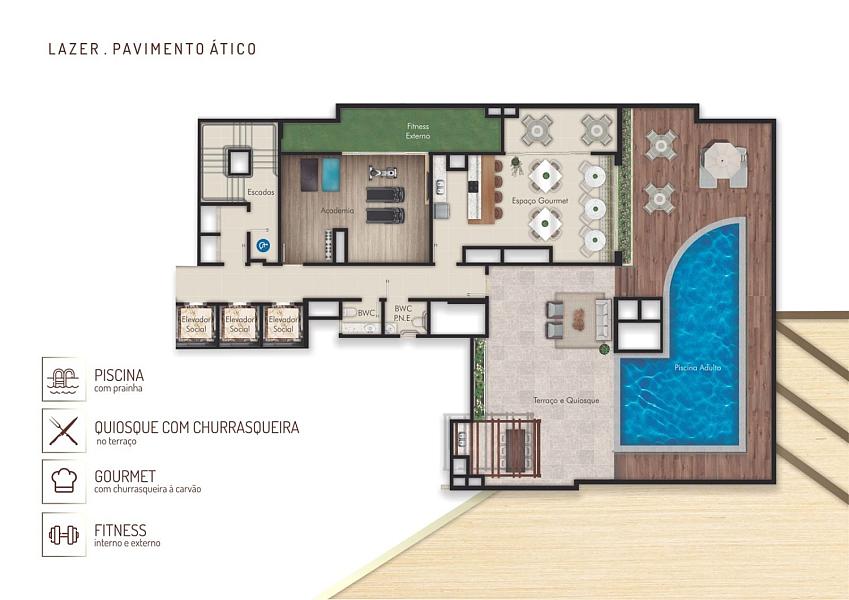 • Aptos 3 suítes (com lavabo) – áreas de 113,35m², 115,85m², 116,70m² e 118,80m².